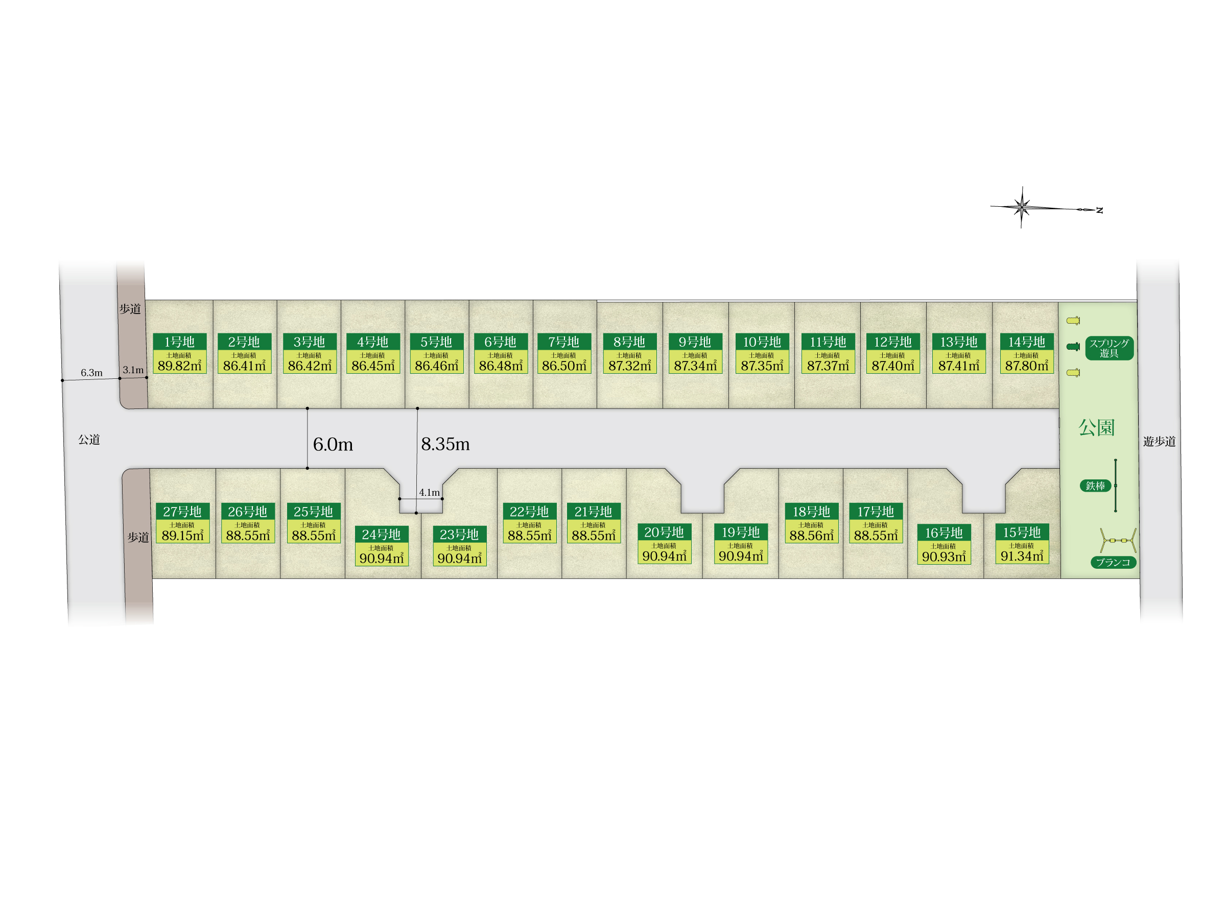- 分譲地北側には、公園をリニューアルオープン。新たにお子様に喜んでいただけるように、スプリングのついた乗物を設置しました。物件カラーのグリーンをあしらっております。