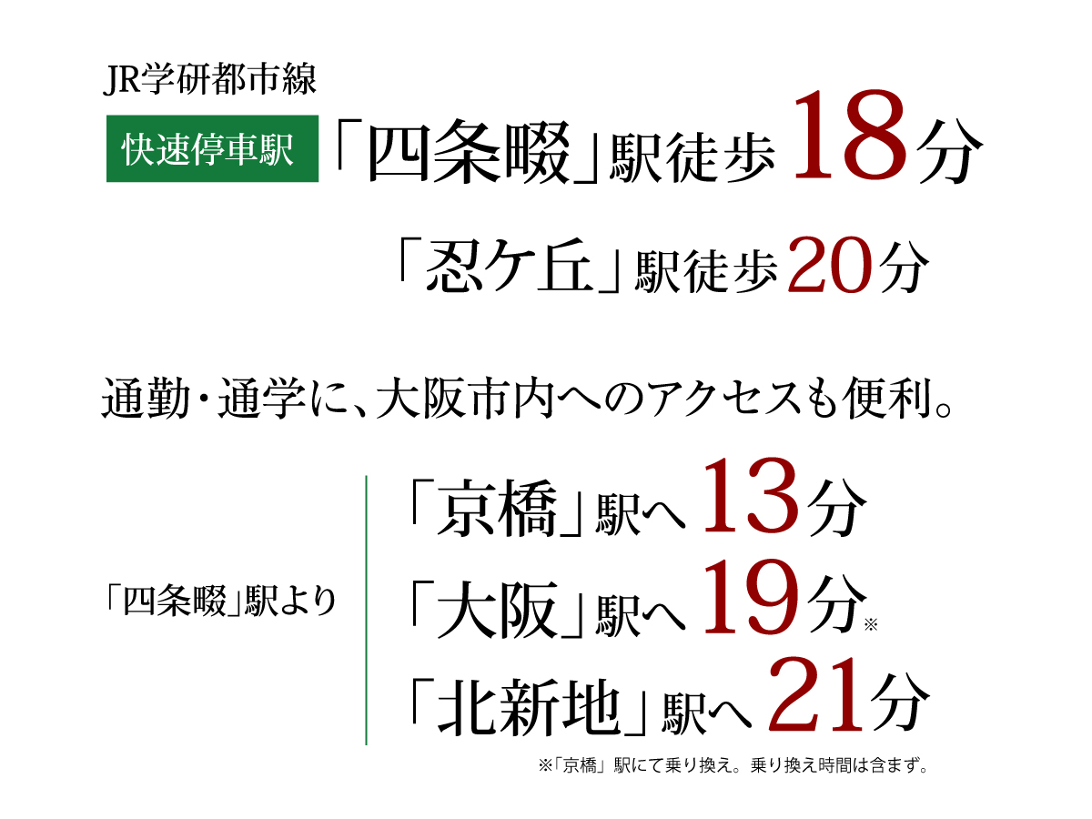 - JR学研都市線「四條畷」駅は快速停車駅。朝のラッシュ時にも10分に1本は快速がご利用頂けます。