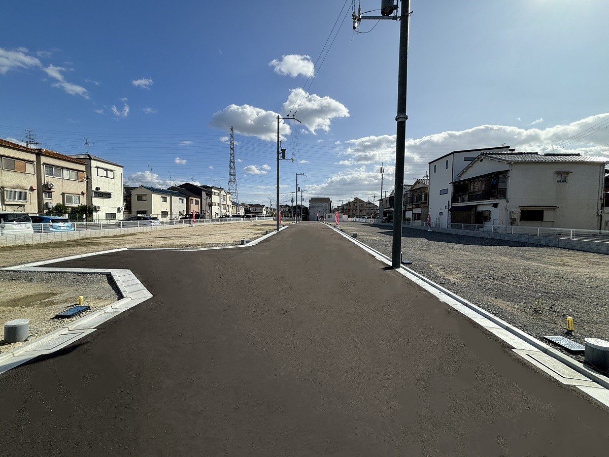 - 南北に抜けるまっすぐな開発道路は約6mの広さ。見通しの良さと、お車同士の往来のしやすさも魅力です。
