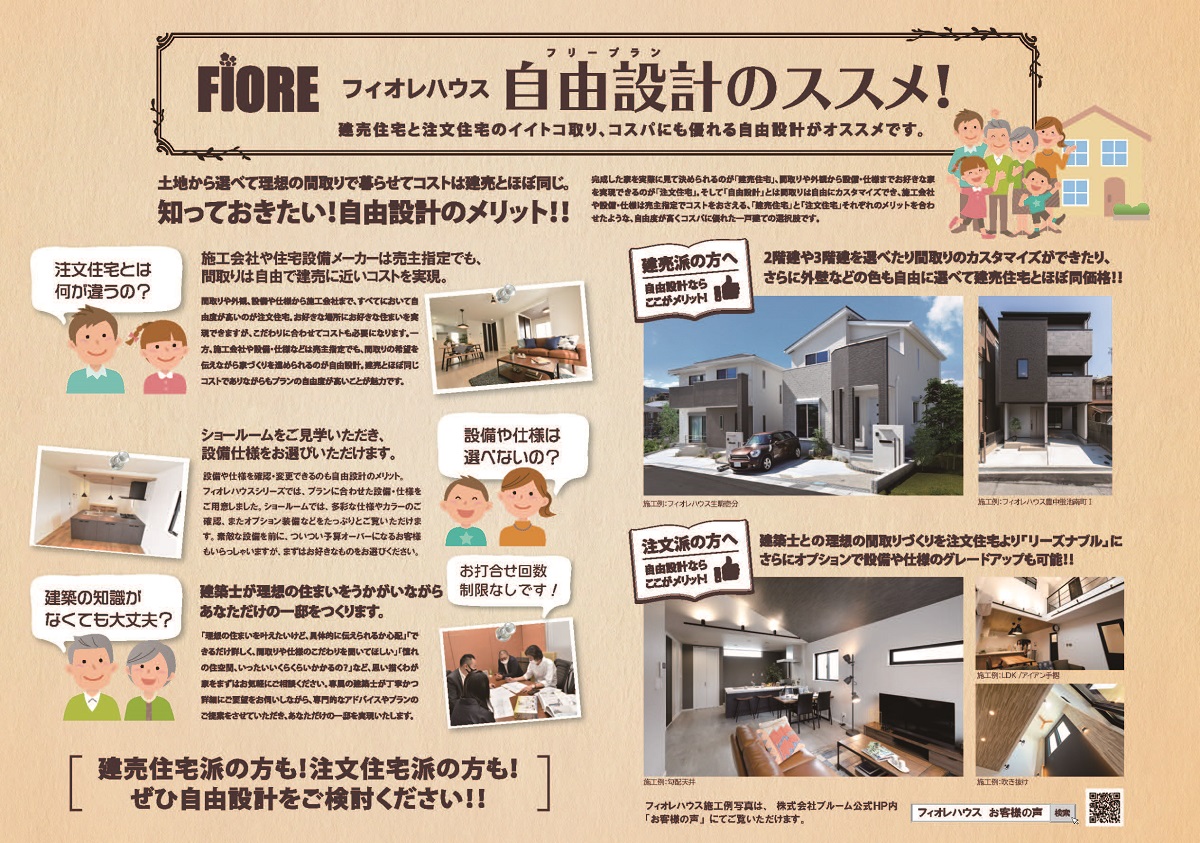 - 専属の建築士とともに、一から間取りを作り上げる自由設計。フィオレハウスシリーズではお打合せ無制限、注文建築並みの自由度でご対応致します。まずは、理想の間取りやインテリアなどのイメージをお聞かせ下さい。