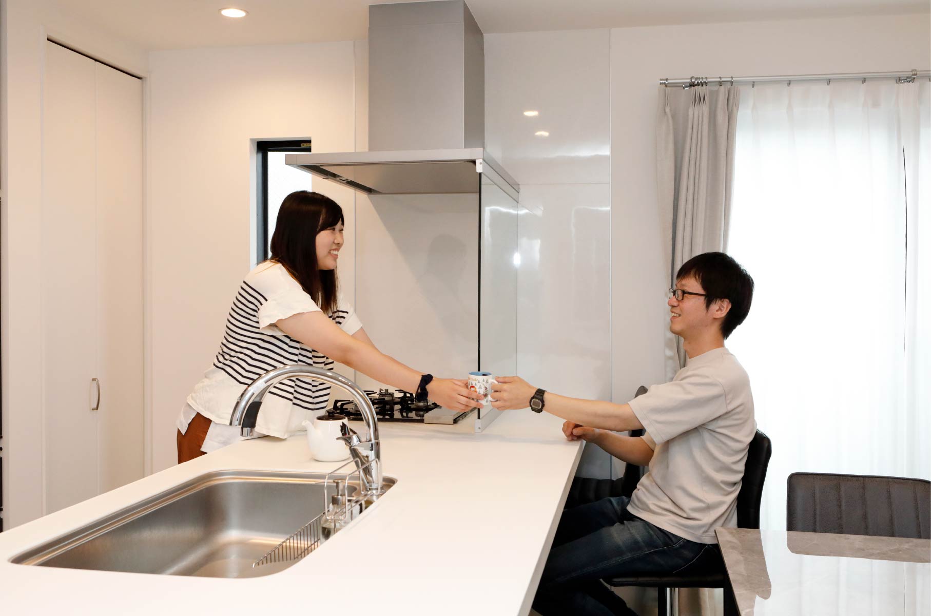 - 自由設計といっても、すでに決まっている仕様があって、そこから選ぶイメージでした。でも実際はショールームに行って、ドアの形状とか床の色とか、自分たちが気に入ったものを選べて、注文住宅のような自由度の高さで家づくりができたという満足感があります。注文住宅と聞くと、ものすごく費用がかかって、自分たちには手の届かないイメージがありましたが、フィオレハウスでは、ちゃんと自分たちの予算内でやりたいことを叶えることができました!あとショールームに通いながら、この設備を選んだらどんな風になるんだろうと、完成形を想像しながら家をつくるのがものすごく楽しかったですね。