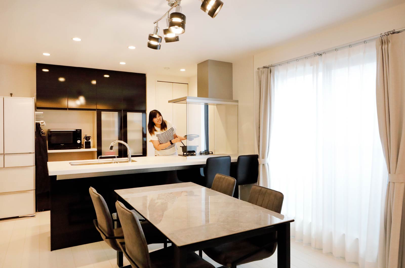 - とにかくモノを隠したかったので、キッチンにはパントリーも付けてもらいました。できるだけモノは片づけて、空間をすっきりと広く見せたかったのです。私は調理師という仕事柄、キッチンには人並み以上のこだわりがあったので、ショールームを見に行って追加の棚を購入するなど、かなり予算を費やしました。キッチンディバイダーを壁ではなく、ガラスにして空間に開放感を出すようにしたのも私のこだわりです!