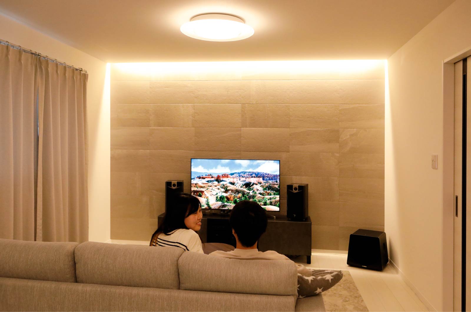- 私自身もそうでしたが、子どもってご飯を食べたら自分の部屋にこもってしまいがち。だからリビングは、スピーカーと間接照明にこだわってシアタールームに。妻の提案でエコカラットを採用し、雰囲気のある空間をつくり上げました。テレビや映画を見たり、ゲームをしたり、家族が自然と集ってくるような場所にしたかったんです。