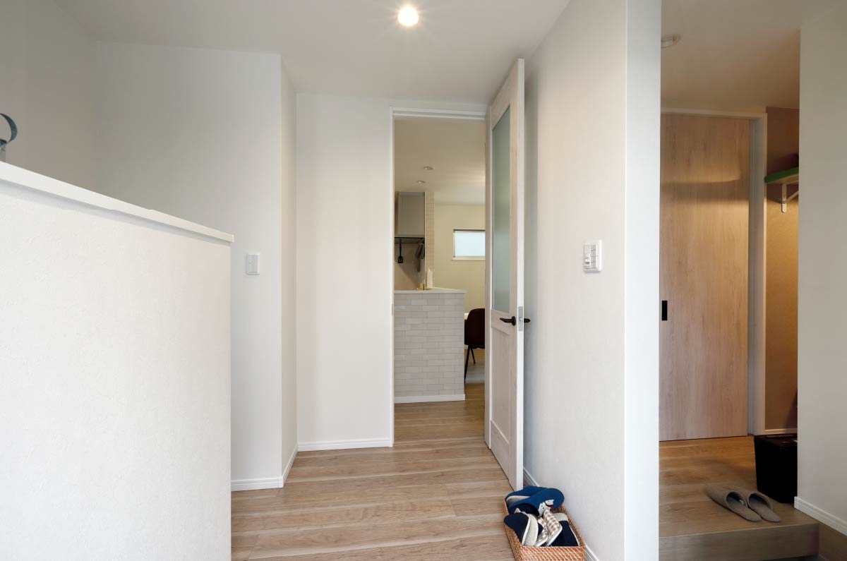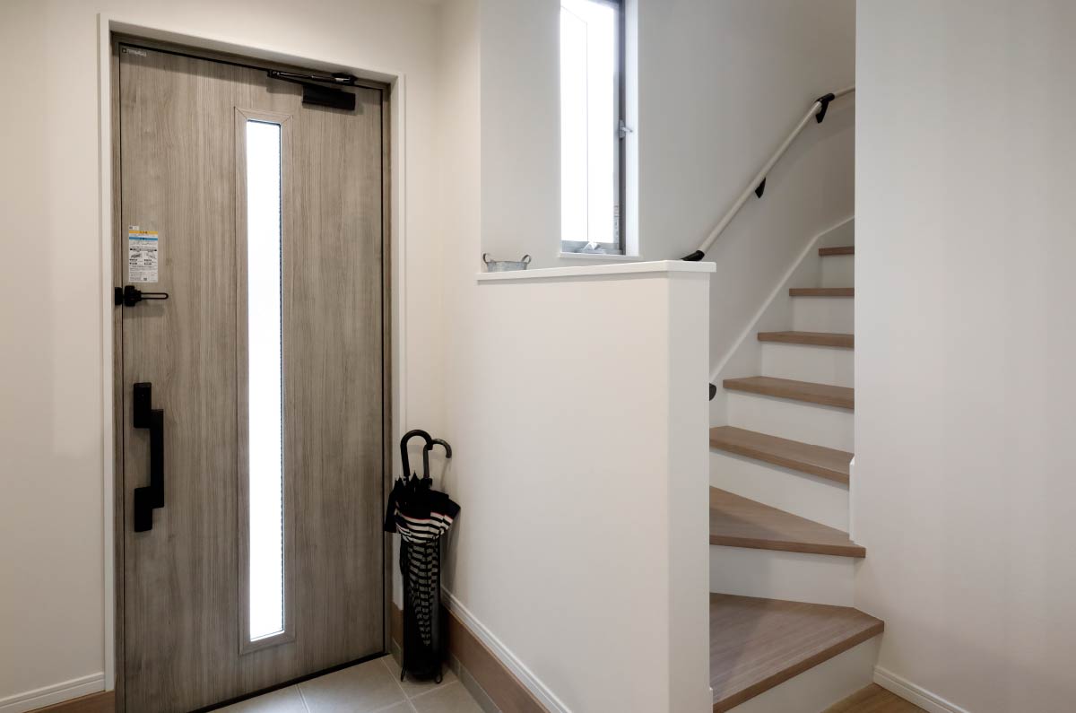 - 実は実際に家が建ってからすごく驚いたことがありました。 それは玄関を開けて左手にある階段部分のところ。図面を見たときは、てっきり上から下まで 壁だと思っていたのですが、上半分はちゃんと空いていて階段が見えるようになっていたんです。 2 階からの灯りや階段横の窓から入る光が、ちゃんと玄関に届くようになっていて、 さすがプロだなと思いました。 こうしたことは自分たちでは絶対に考えつかないこと。だからものすごく助かりますし、 安心してすべてをお任せしていました。僕たちの要望は、あれこれ細かく言わなくても、 きちんと随所で叶えられているという印象があります。