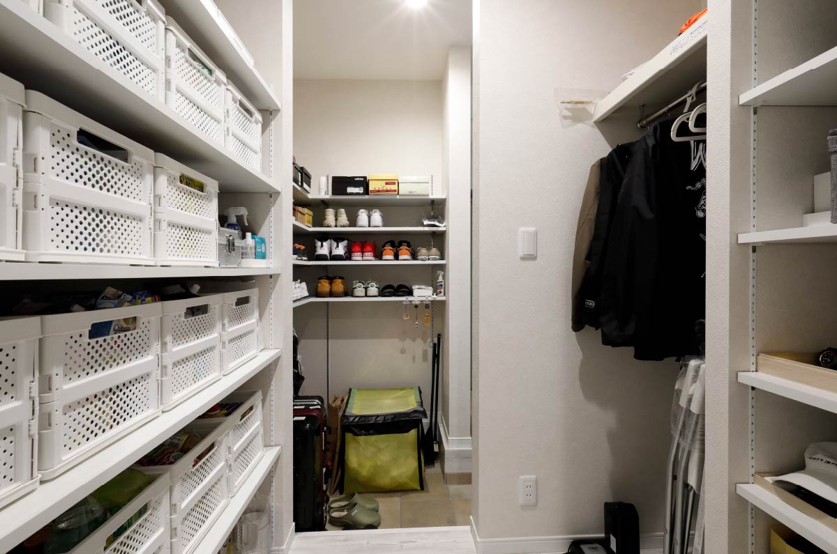 - 玄関ですね。新しい住まいをつくるにあたり決めていたのは、家族とお客様の利用するエリアを分けること。家族については、玄関を上がったら、その場で荷物を置いて、上着をかけ、洗面室で手洗いをし、洗濯物は洗濯かごに入れる、それからリビングへ。そうした動線ができるように間取りを決め、玄関には大容量の収納もつくってもらいました。