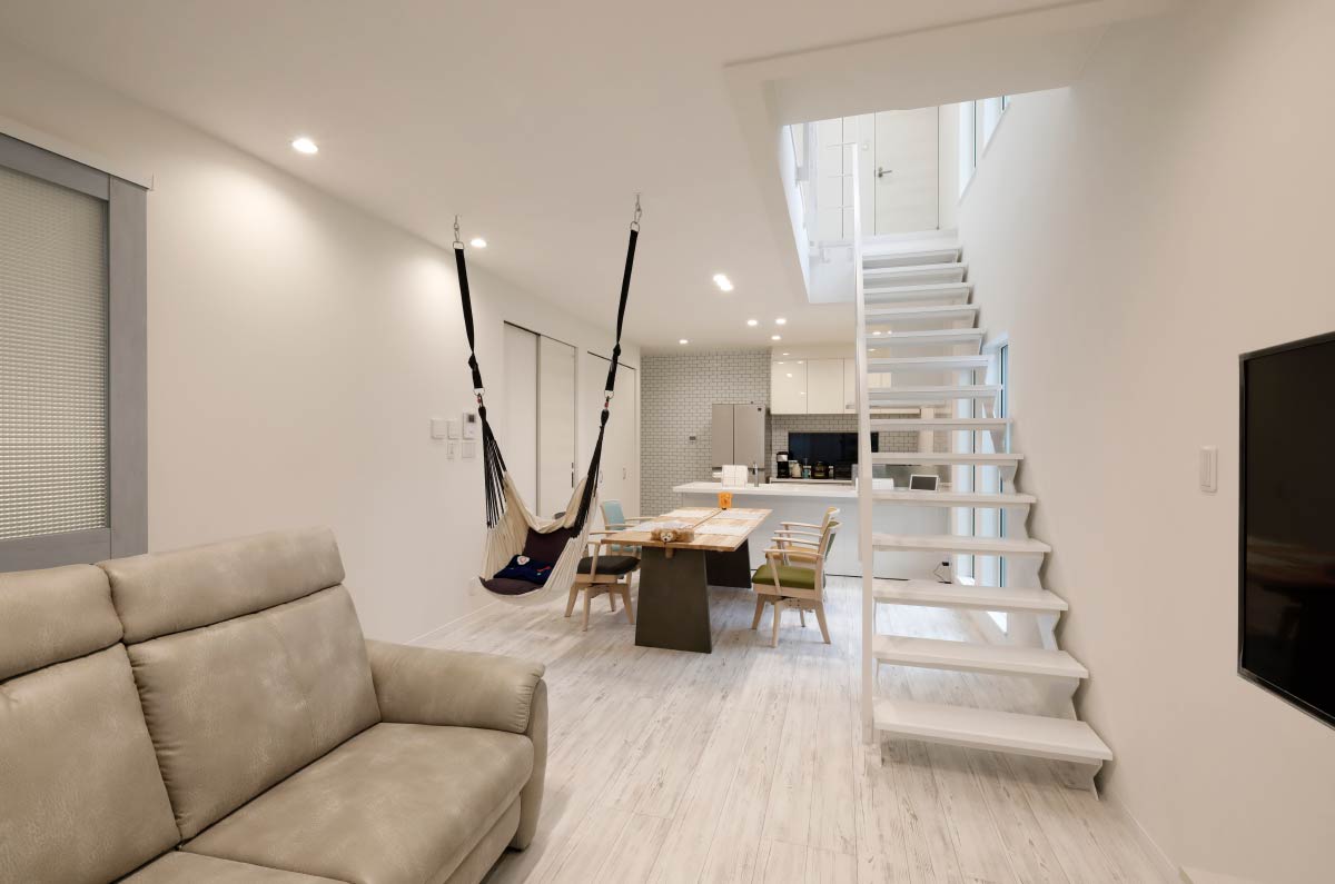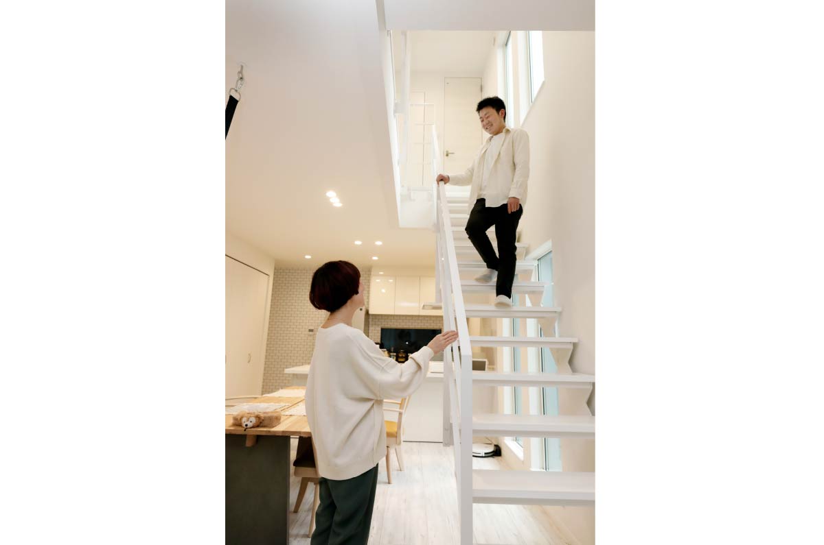 - 階段はリビング内にというのが私たちの希望。ただ壁を設けて階段をつくるとリビングが狭く感じられるので、建築士の片山先生からは、鉄骨の階段にするアイデアをいただきました。また吹き抜けにして、大きく窓をとるというのも片山先生のアドバイス!おかげで上からの明かりも採り込めて、リビング全体が明るく開放的に。以前住んでいた家が暗かったこともあり、広く明るいリビングはまさに私の憧れ。大満足の空間になりました。