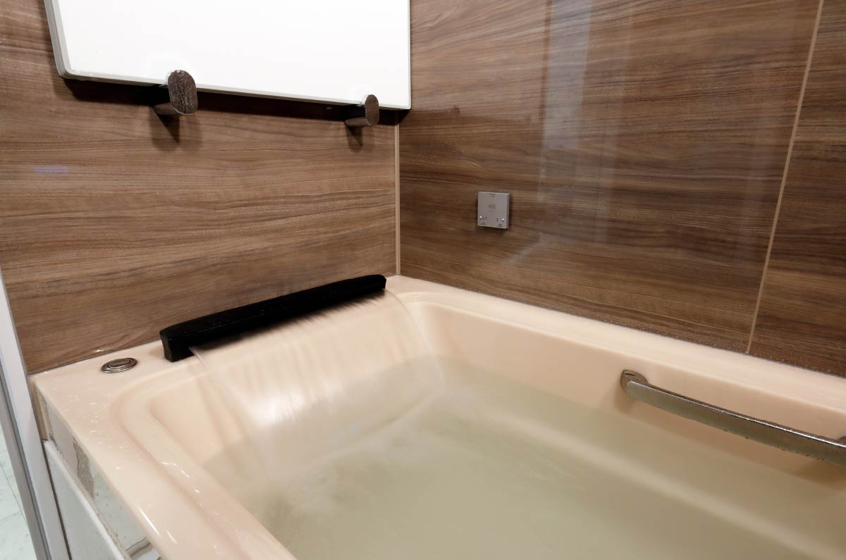- お風呂ですね。広い浴槽と肩湯が息子たちからのリクエスト。肩湯はオプションで設備を取り付けしました。湯船の上から別でお湯がでてくる仕組みになっています。予算はオーバーしましたが、それは納得の上でのこと。おかげで最上級のバスルームが完成しました!